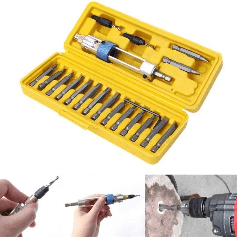 O conjunto de ferramentas que ajuda a fazer furos e acionar parafusos sem a necessidade de trocar como brocas. Selecione dois bits de tamanho diferente, faça o furo piloto, gire o braço do pivô em seguida, aperte qualquer parafuso, porca ou fixador.