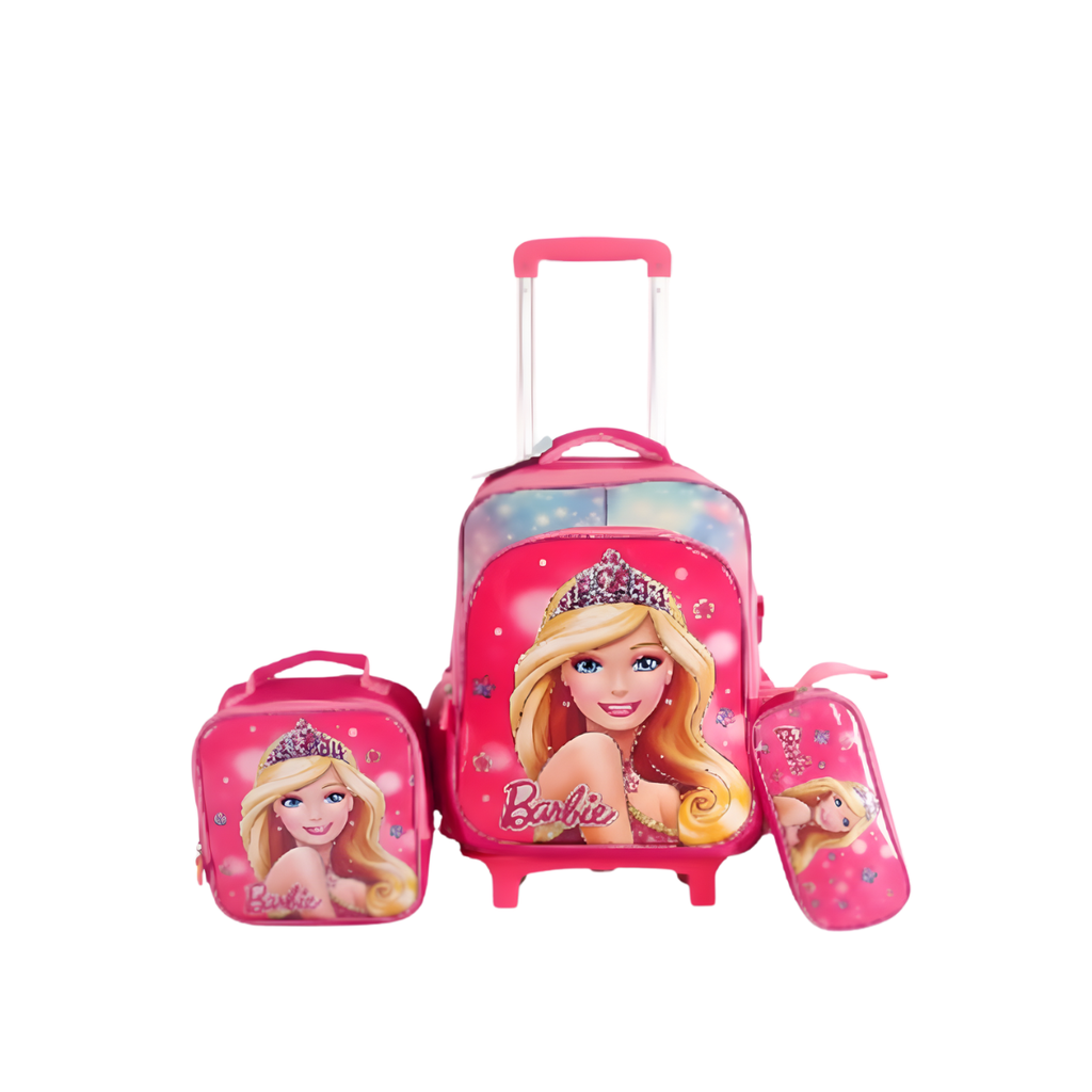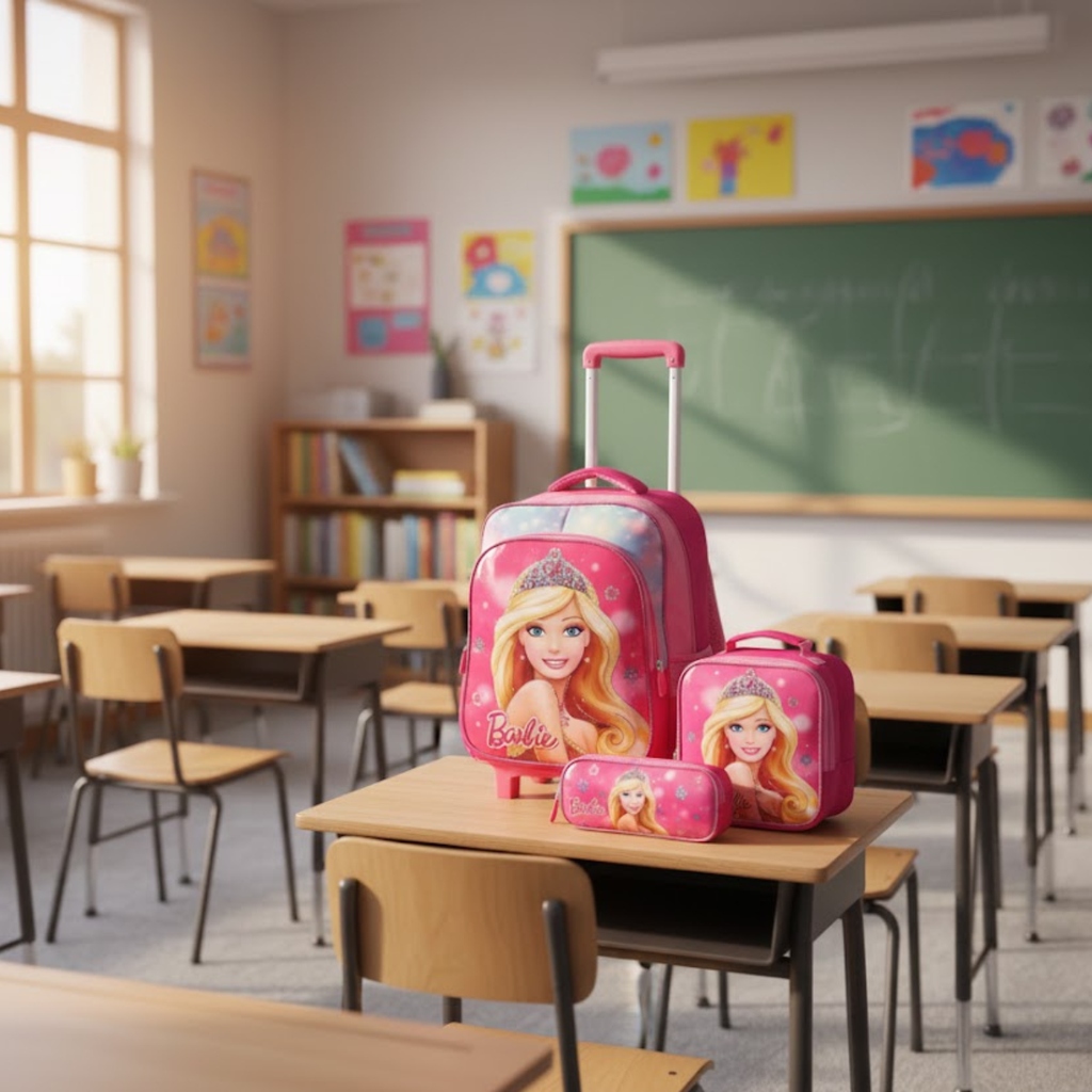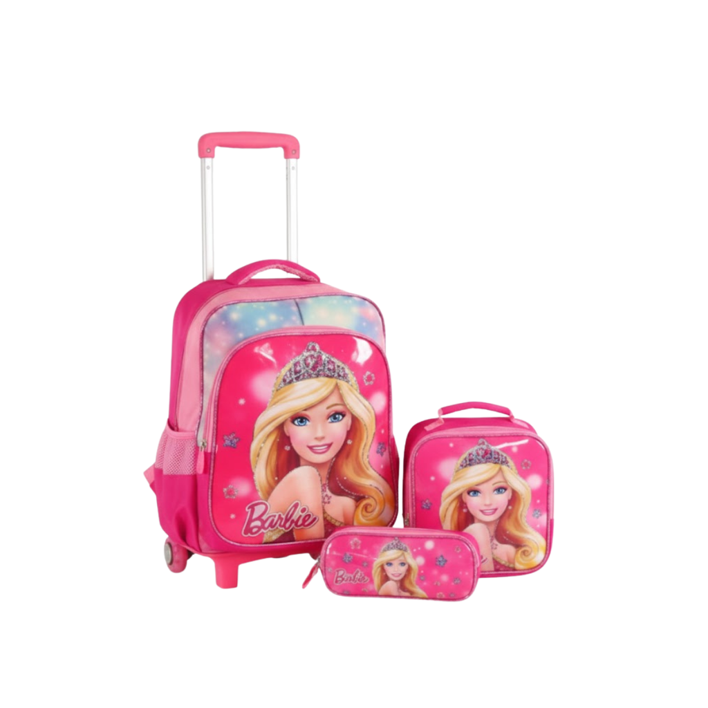 O Conjunto Escolar 3D Barbie com Mochila de Rodinhas, Lancheira Térmica e Estojo é perfeito para meninas que buscam estilo, facilidade e organização para o dia a dia escolar.