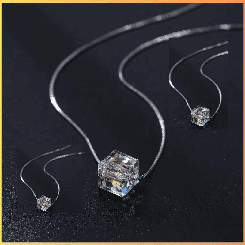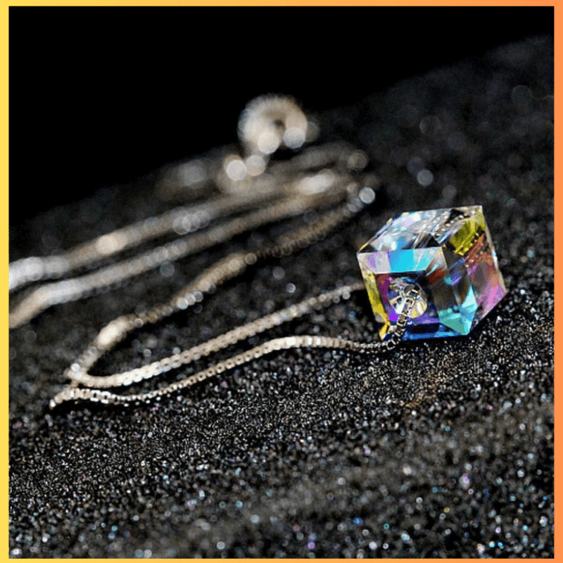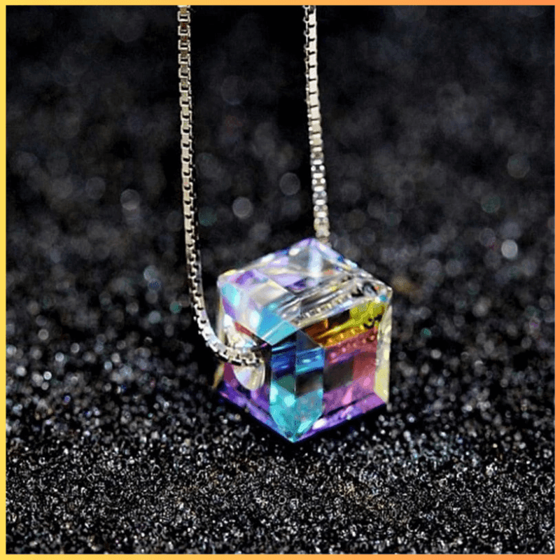 Colar Cubo de Cristal Iridescente, simples, porém elegante. Este colar de cubo de cristal reflete a luz e brilha com um lindo arco-íris quando a luz o atinge.